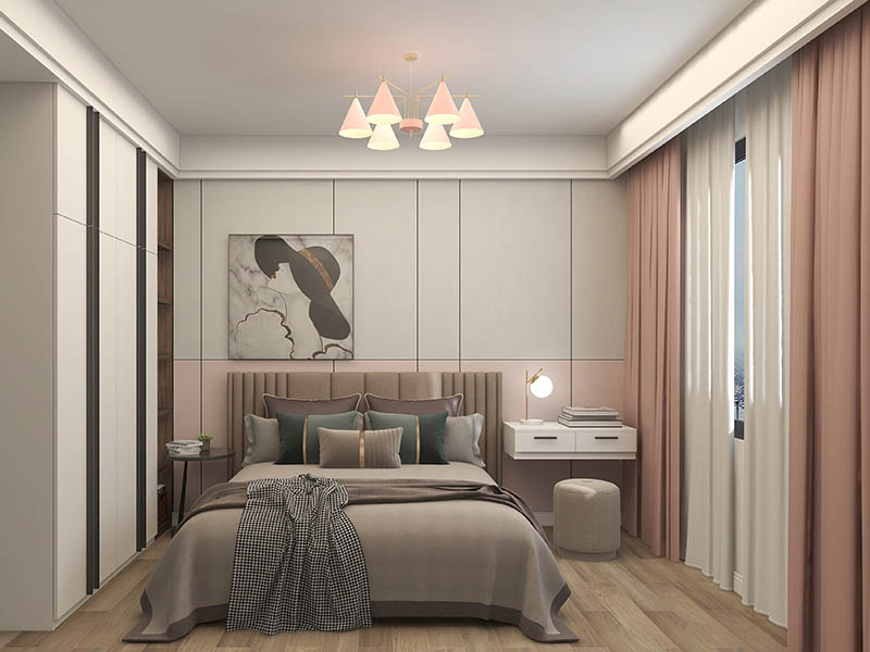 木質(zhì)拼接臥室背景墻可以更好地融入環(huán)境,自然氣息的木紋,中和了空間帶來的疏離感,讓臥室多了一份溫潤柔和,有了家的包容性。