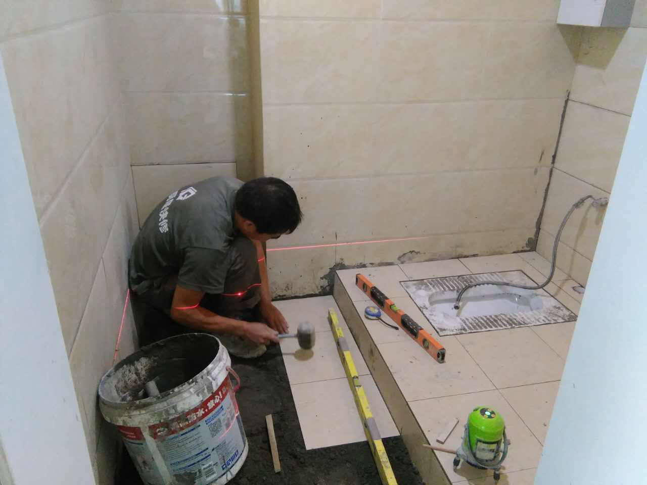 蹲便器的排污口和落水管的預留口均涂上粘結劑或者膠泥,將蹲便器的排污口與落水管的預留口接駁好,校正蹲便器位置。砌磚固定蹲便器,要預留填碎石的缺口。